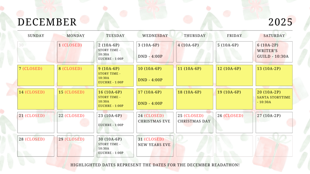 We will also be bringing back out December readathon. For every 50 pages you read from the 7th to the 20th you will earn a raffle ticket for our prize drawing. The prize is a personal Christmas basket with three items of your choice (Maximum $30, no gift cards). All pages must be reported to the staff by the time we close on the 20th. The winner will be contacted on the 23rd.