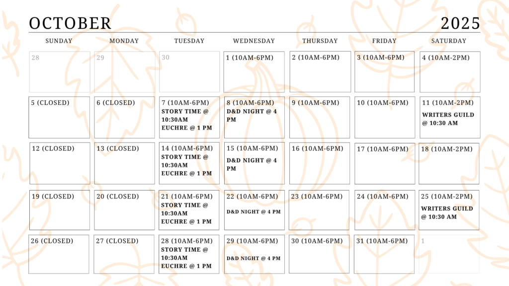 Its time for new hours and new programs! Storytime will begin at 10:30am every Tuesday this month. Euchre will take place at 1pm every Tuesday this month. Dungeons and Dragons (DND) will take place from 4pm-5:30pm on the 8th, 15th, 22nd, and 29th. Our Writer’s Guild will meet on the 11th and 25th!